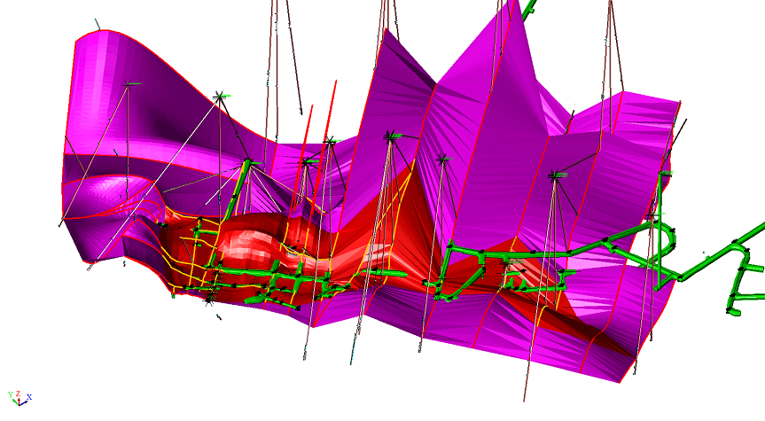 依據(jù)地質編錄三維化結果對剖面邊界開展二次圈定工作,實現(xiàn)三維化邊界控制,較傳統(tǒng)方法更精準,真實反映礦體空間位置、形態(tài)。