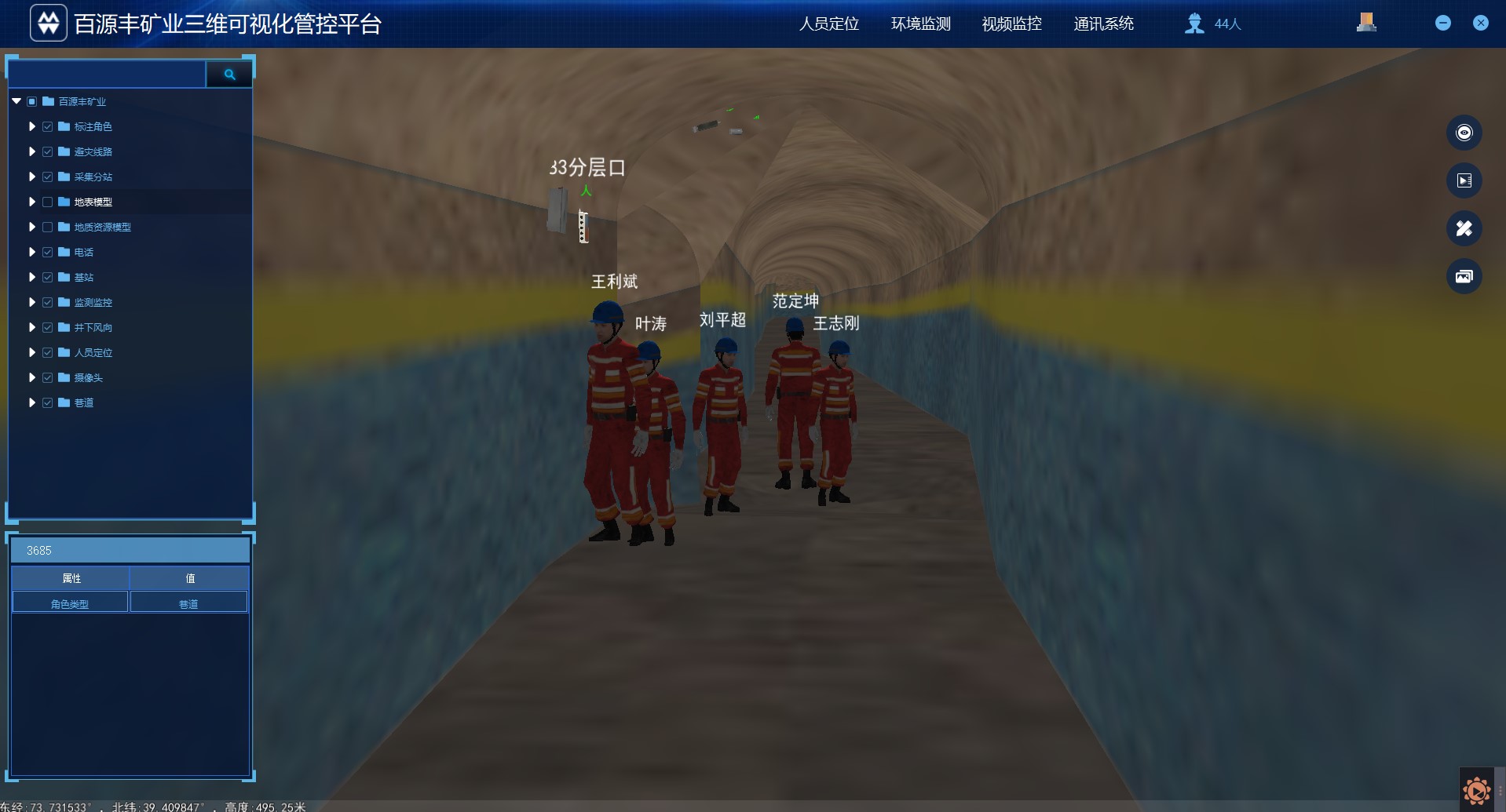 三維管控軟件平臺以礦山資源與開采環(huán)境三維可視化和虛擬環(huán)境為平臺,利用三維GIS、虛擬現(xiàn)實(shí)等技術(shù)手段,將礦山地上地下場景、井巷工程進(jìn)行真實(shí)三維數(shù)字化建模,實(shí)現(xiàn)對礦山生產(chǎn)環(huán)境、生產(chǎn)狀況、安全監(jiān)測、人員和設(shè)備狀態(tài)的實(shí)時(shí)高仿真顯示。在真三維環(huán)境中集成礦山開發(fā)與運(yùn)行的相關(guān)信息,解決礦山信息化建設(shè)過程中基礎(chǔ)信息不足、信息孤島和可視化等方面的問題。